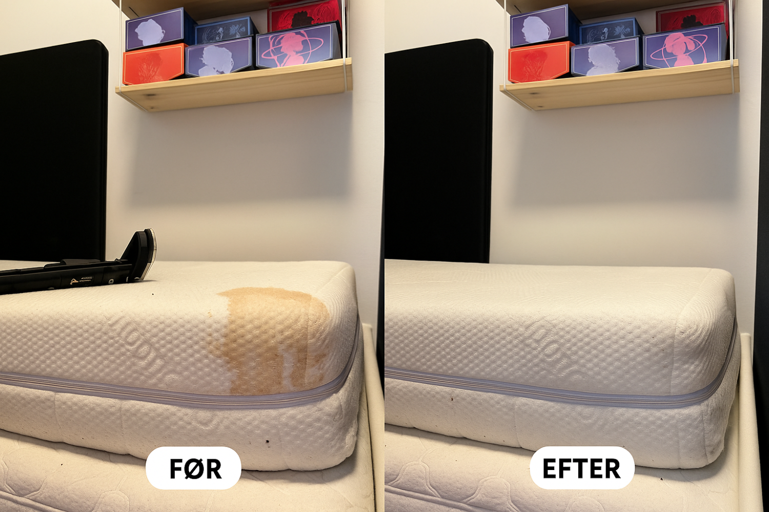 På billederne kan I se et klassisk eksempel fra vores hverdag – en stor plet på madrassen. Før-billedet taler for sig selv, og efter bare én behandling med SpotClean HydroSteam Select, er pletten helt væk. Forskellen mellem FØR og EFTER er virkelig markant.