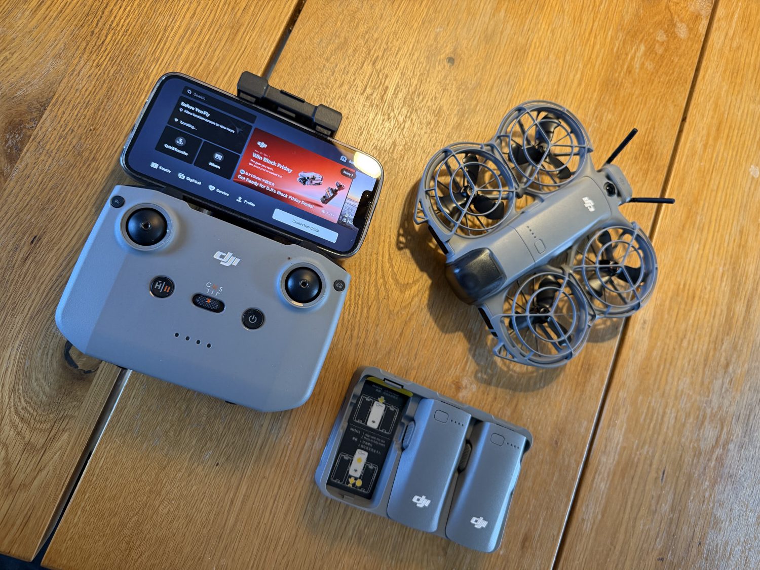 Vi pakkede fly more-pakken ud på en søndag formiddag, monterede batteriet, propeller og beskyttelsesringe og gjorde klar til første flyvning. Dronens størrelse gør, at man ikke føler sig bekymret for at tage den med i rygsækken.