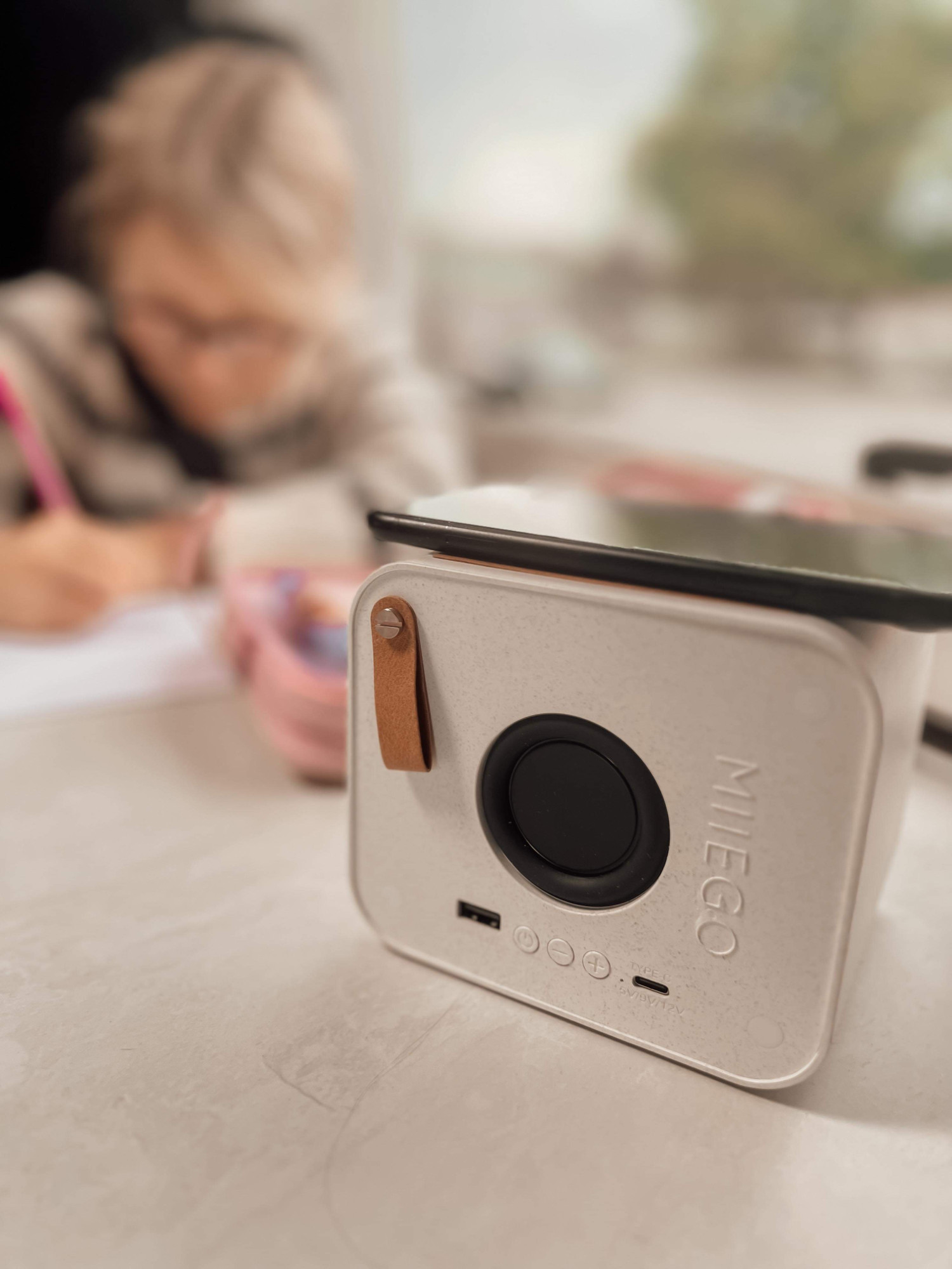 Både børnene og jeg hører en del lydbøger, og det kan godt være lidt af en strømsluger, så vi er blevet rigtig glade for at kunne sætte lydbogen til på højttaleren, mens telefonen ligger og lader samtidig.
