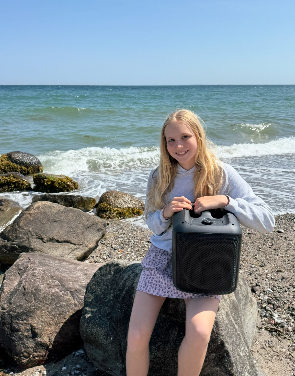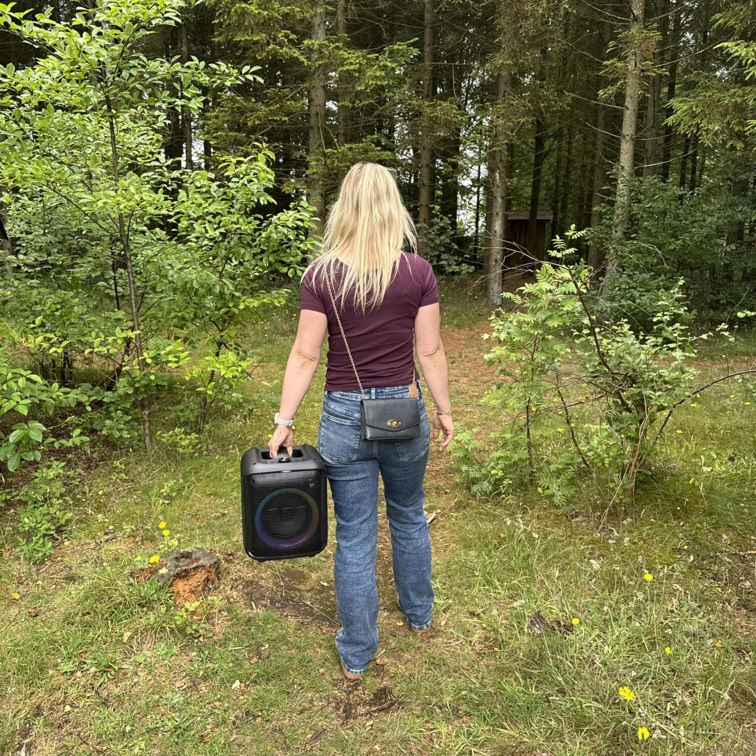 Denne vildt lækre højtaler fra MIIEGO, har et håndtag, så den er let at transportere med sig rundt. Og det har pigerne i høj grad benyttet sig af. Den har været med i springhallen, på stranden, på legepladsen, i haven, er blevet brugt herhjemme til pigefødselsdag hvor pigerne hyggede til stopdans, og jeg lånte den faktisk også med til min søster polterabend, hvor den blandt andet blev slæbt med rundt inde i byen i Århus. Så den er utrolig let at have med sig.