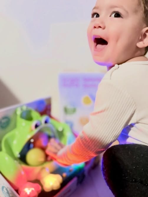 Testfamilien har testet Spinnin’ Spots Giraf™ og Poppin’ Ball Frog™ boldspil fra Bright Starts.